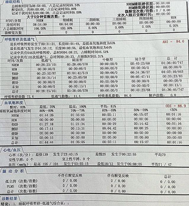 第二天结果就出来了,洪主任拿到肖健的睡眠监测报告后,发现肖健的AHI(指每小时睡眠内呼吸暂停加上低通气的次数)为84,记录中共有646次呼吸暂停,总时间为4小时08分零23秒,占总睡眠时间46.51%,记录中共有101次低通气,总时间为28分23秒。确诊为睡眠呼吸暂停—低通气综合症即鼾症。”